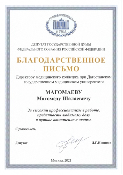 Коллектив Медицинского колледжа ФГБОУ ВО ДГМУ Минздрава России поздравляет директора Магомаева Магомеда Шалаевича с вручением Благодарственного письма депутатом Государственной Думы Федерального Собрания за высокий профессионализм в работе, преданность любимому делу и чуткое отношение к людям. Это признание достижений и профессионализма. Коллектив уверен, что это начало новых свершений и стремлений.