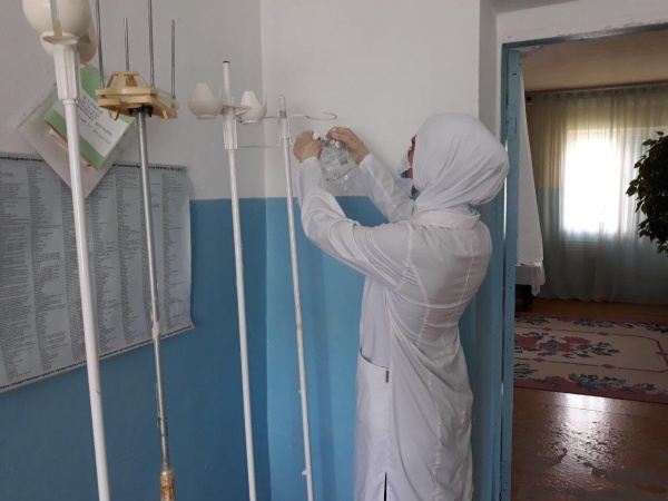 Тагирова Кавсарат 3 курс 2 группа акушерское отделение. Проходит практику в ГБУ РД МУЗ "Новосельская участковая больница". Помогает медсестре набирать препарат для в/в введения.