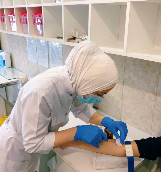 Нухова Санижат Магомедова 3 курс 1 группа сестринское отделение. Проходит практику в Медицинском центре "Пульс". Проводит  технику внутривенной инъекции пациенту строго соблюдая все правила безопасности. А так же измеряет АД с последующим занесением в медицинскую документацию.