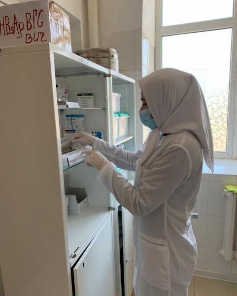 Шамилова Айша 4 курс леч дело ГБУ. РД. РЦТО (травматология) им Цахаева. Раскладывает лекарственные препараты.
