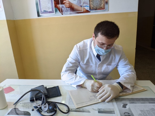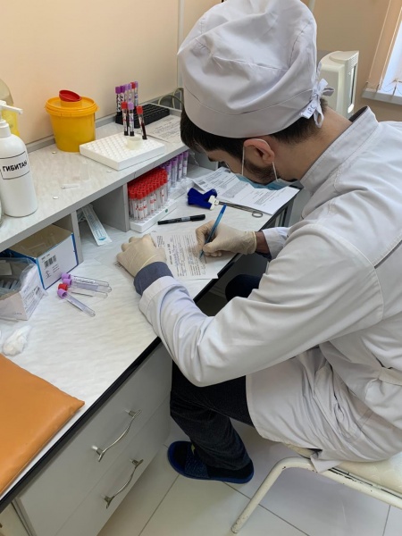 Исаев Арсен 1 группа 4 курс Лечебное дело. Проходит практику в «ГБУ РД» «Республиканская станция переливания крови». Заполняет мед документацию.