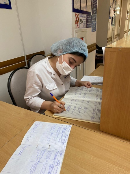 Каялова Айша студентка 4 курса 2 группы лечеьного отделения . Проходит практику в РОТЦ имени Цахаева, заполняет журнал поступивших больных в отделение.