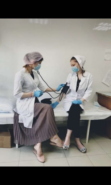 Алхасова Патимат Салмановна, 4 курс 6 группа сестринское отделение. Работает в ГБУ РД "Наркологическом диспансере". Проводит технику измерения давления.