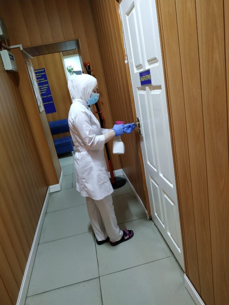 Нухова Санижат 3 курс 1 группа сестринское отделение. Проходит практику в Медицинском центре "Пульс". Проводит обработку помещения спиртовым антисептиком.