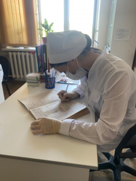 Мирзаева Мадина 4 курс 6 группа сестринское отделение. Проходит практику в "Новолакской районной больнице". Заполняет медицинскую документацию.