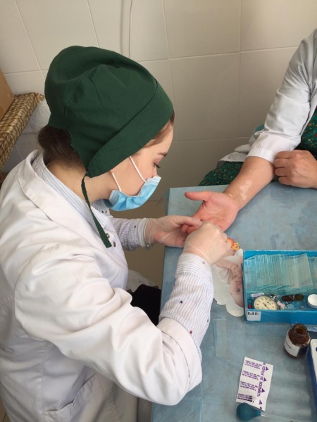 Гусейнова Айшат 4 курс 6 группа сестринское отделение. Проходит практику в Детской поликлинике "5". Берет кровь на анализы у детей. Планирует в дальнейшем работать в этой поликлинике.