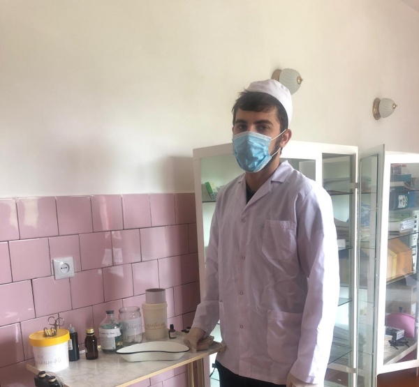 Мусаев Ахмед студент 4 курса 2 группы, подготавливает все необходимое для выполнения капельницы в ФАП с .Первомайское.