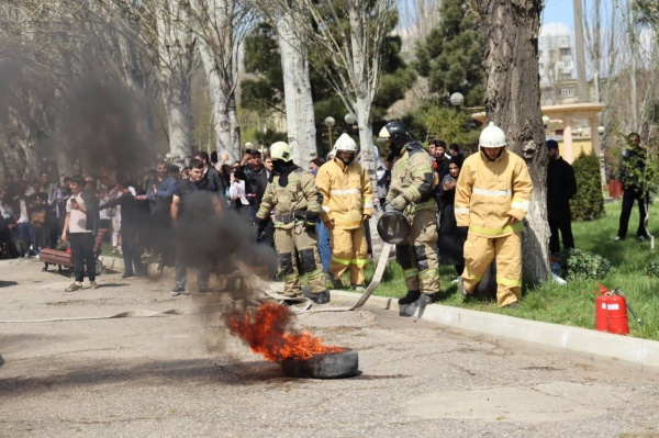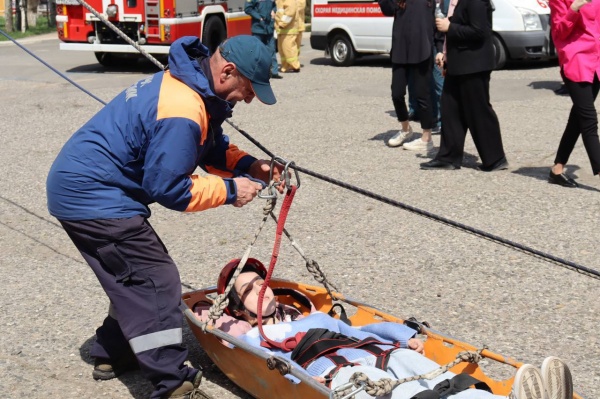 Второй мастер-класс был посвящен эвакуации учащихся из учебного корпуса при землетрясении бригадами спасателей МЧС. Первым способом веревкой создается наклонная воздушная переправа. Затем, пострадавшего укладывают в носилки акья, подвешивают к натянутым веревкам и эвакуируют через спусковое устройство, регулируя скорость спуска. Далее, пострадавшего передают работникам скорой помощи. Второй способ – с помощью спускового роликового устройства, по закрепленной за опору на верхнем этаже веревке спасатели осуществляют спуск пострадавшего в «косынке» с сопровождением спасателя.