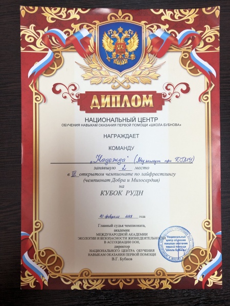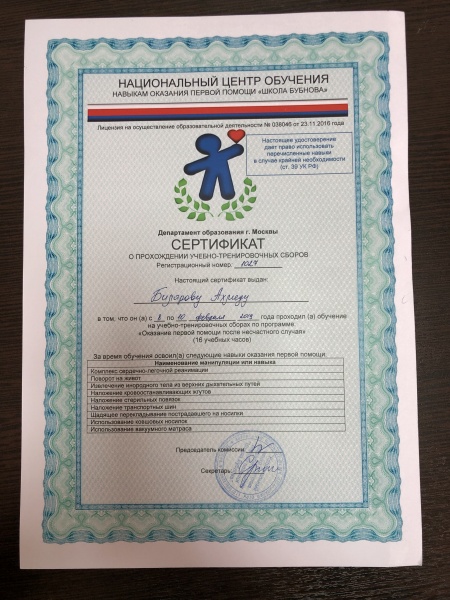 Так же члены команды прошли обучение в нациоанльном центре обучения навыкам оказания первой помощи «Школа Бубнова» и получили удостоверения спасателей в соответствии с международными правовыми нормами.