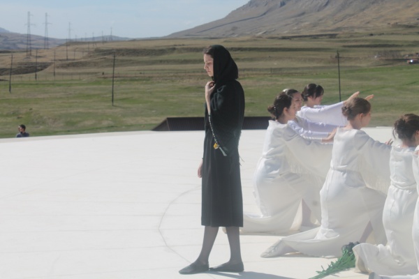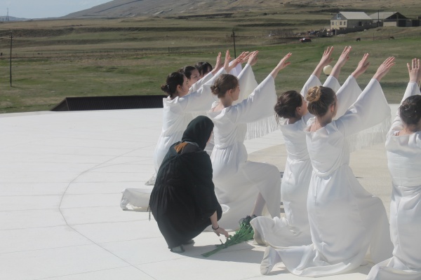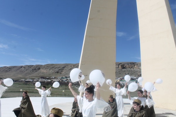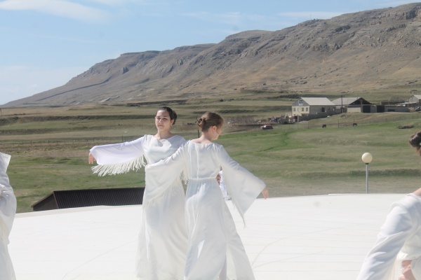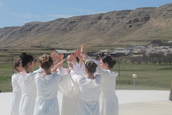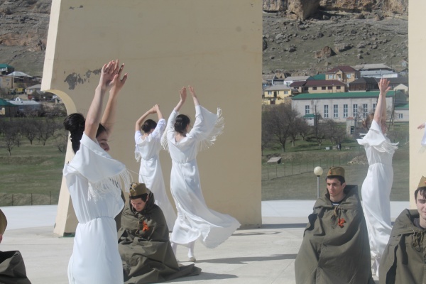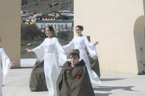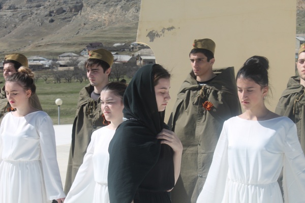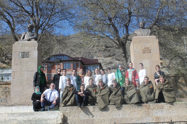 Активисты колледжа вместе с преподавательским составом у подножия памятников Расула Гамзатова и его отца Гамзата Цадаса.